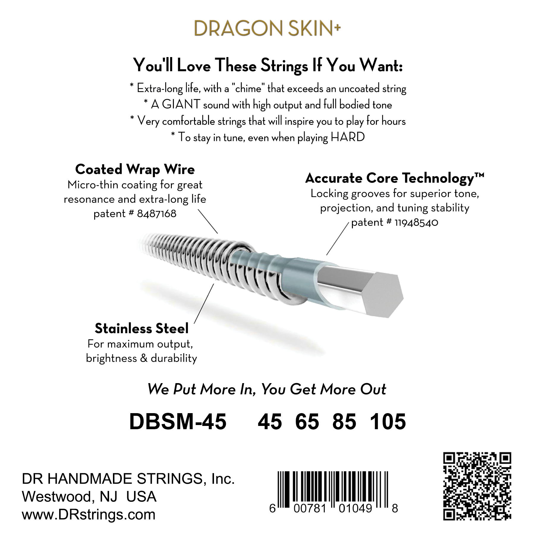 Our Accurate Core technology grooves on the core to match the threads, allowing the string to vibrate to its full potential. A very thin coating on the thread provides longer string life, while having the feel of untreated strings. Designed for better sound and feel, the Dragon Skin+ are second to none. The Difference is Real.