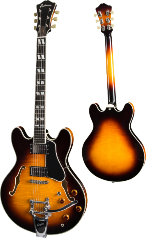 Ostensibly inspired by an american classic double cutaway semi-hollow with central bloc, EASTMAN Thinline Laminate T486 (50276) is a high quality and versatile instrument featuring layered Maple top/back/sides, Maple set-neck, Ebony fingerboard, and Seymour Duncan Phat Cat single-coil pickups (true P-90 sound for any humbucker equipped guitar without modifications).