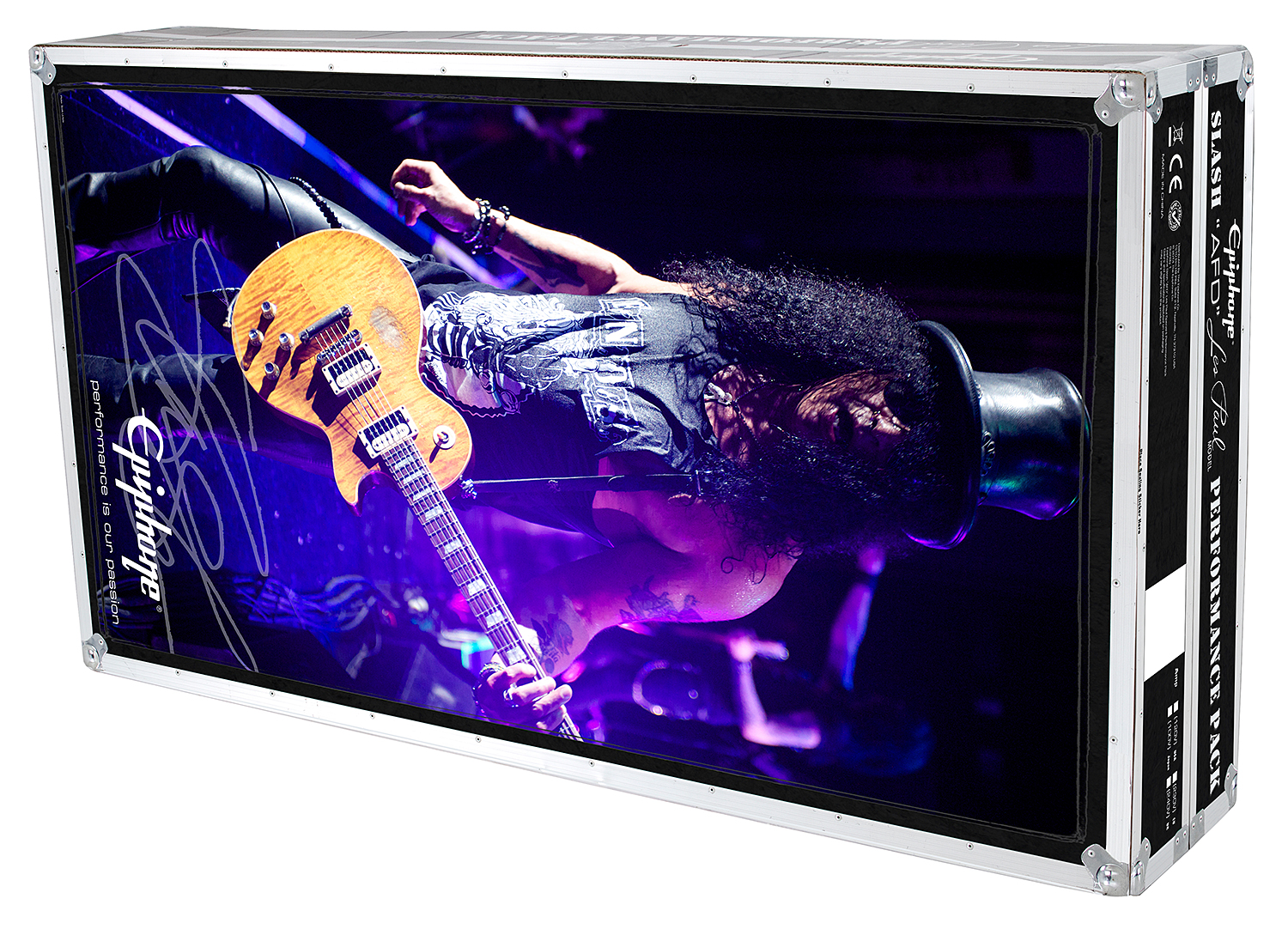 Epiphone ist stolz Ihnen die neue Slash “AFD” Les Paul Performance Pack zu vorstellen. Für Anfänger und Profis ebenso, einschließend eine von Slash designierte Les Paul II Classic Appetite Amber, ein Snakepit Verstärker, eine Gitarrentasche, custom Slash Signature Picks und freien Online-Unterrichte.