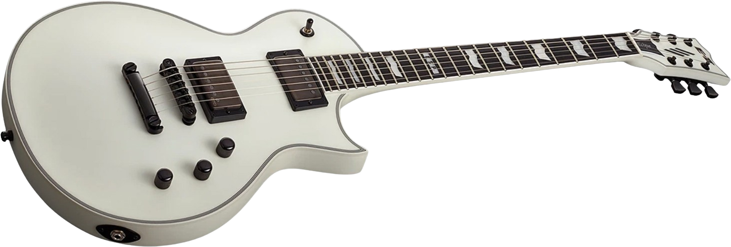 ESP E-II Eclipse (Snow White Satin) solid body electric guitar offers a collection of top-tier components, like a bone nut, ESP strap locks, Gotoh locking tuners, and a Gotoh TOM bridge and tailpiece. Perhaps most impressive is its set of EMG 57TW/66TW set for coil splitting each active pickup with individual push-pull controls on both volume knobs.