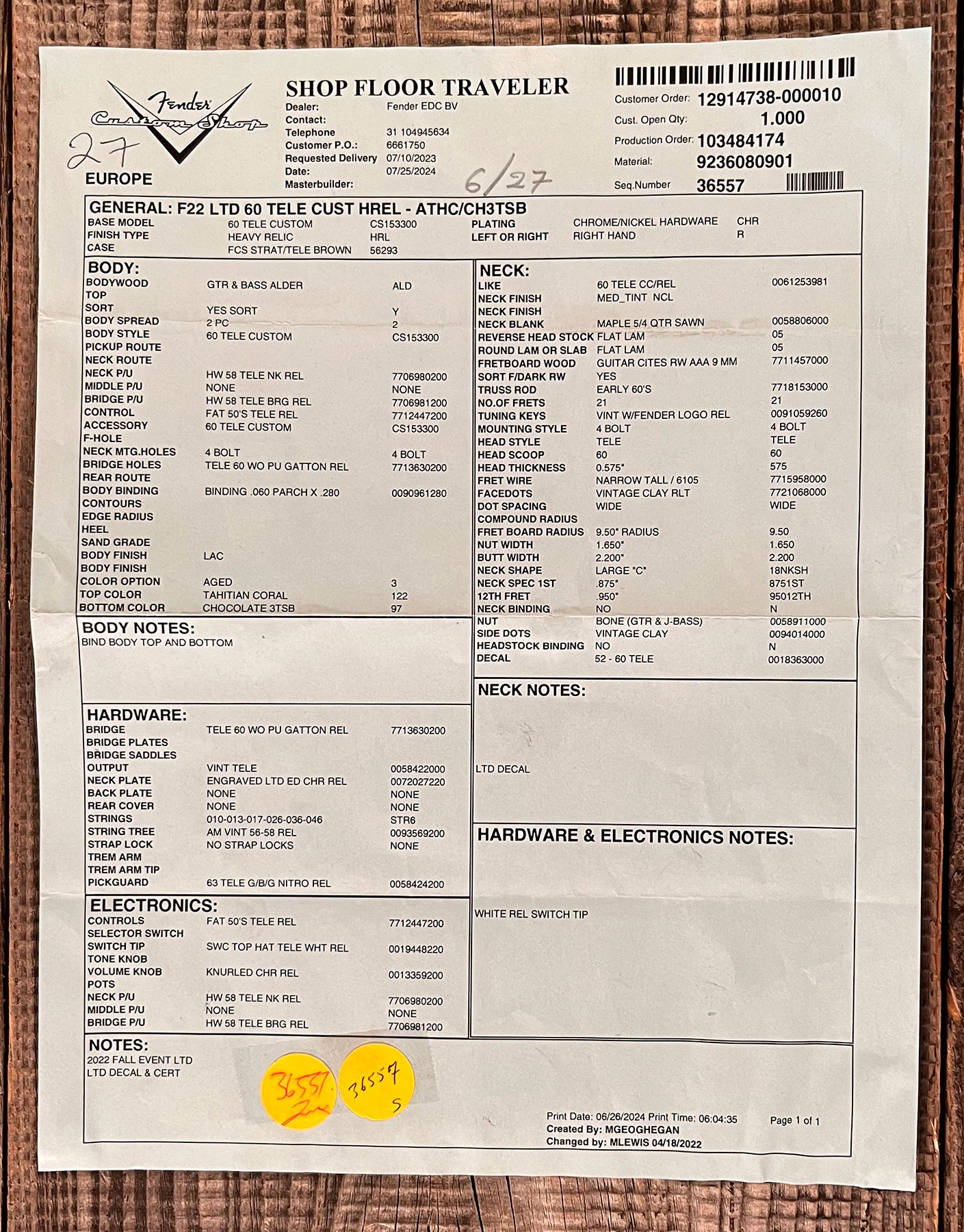 Developped around a "1960 Telecaster Custom Base Model",FENDER Custom Shop Time Machine 1960 Telecaster Custom Heavy Relic Aged Tahitian Coral Over Chocolate 3-Color Sunburst (9236080901) solid body electric guitar features 2-pieces "sort for lightweight" Alder body, "quarter-sawn" Maple neck, "sort for dark" Rosewood fretboard (Large C profile, narrow-tall frets, 9.5" radius), Custom Shop Hand-wound '58 Tele pickups and traditional/vintage-style parts.