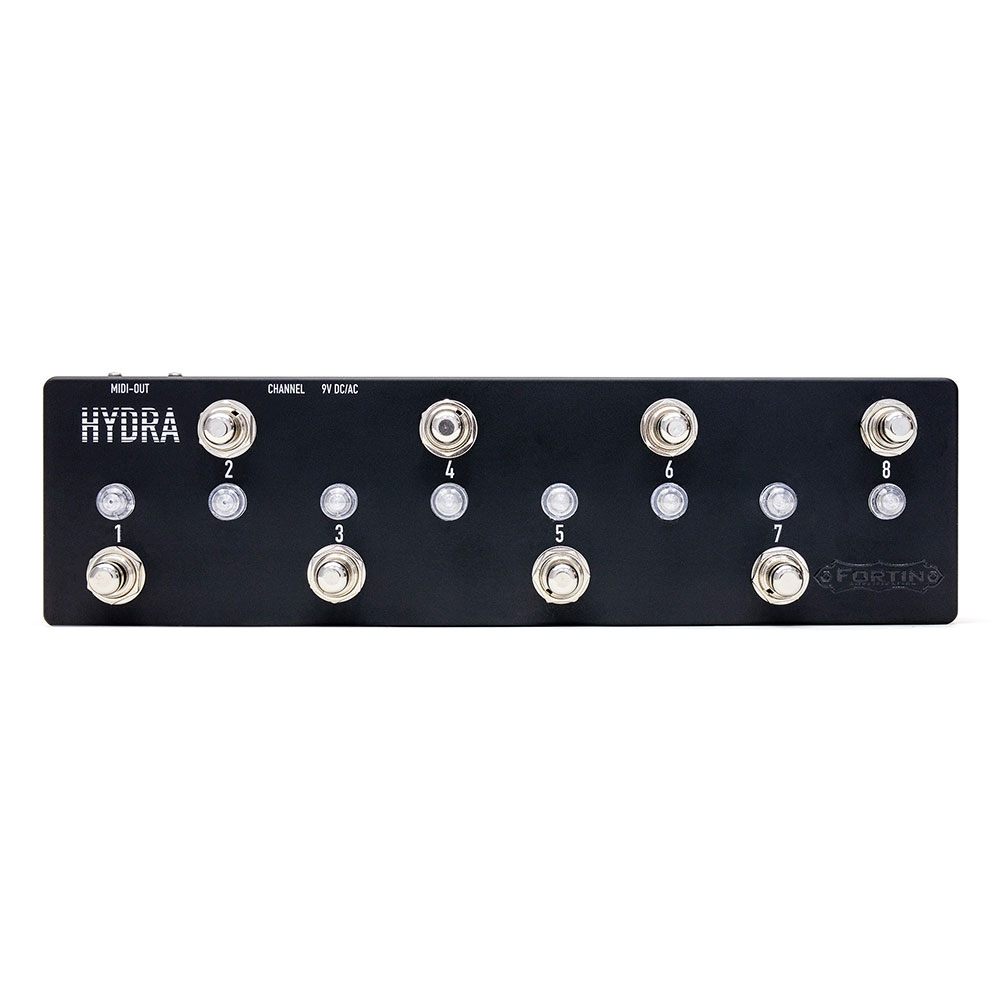 Retaining the smallest possible footprint for fly date and tight pedalboard applications, the FORTIN AMPS Hydra Midi Foot Controller features 8 buttons, multiple power supply mating, DC/AC inlet or outside pins on 7 pin MIDI out connector, program change 0-8, external midi channel select 1-16 and high bright blue LEDs for stage use.