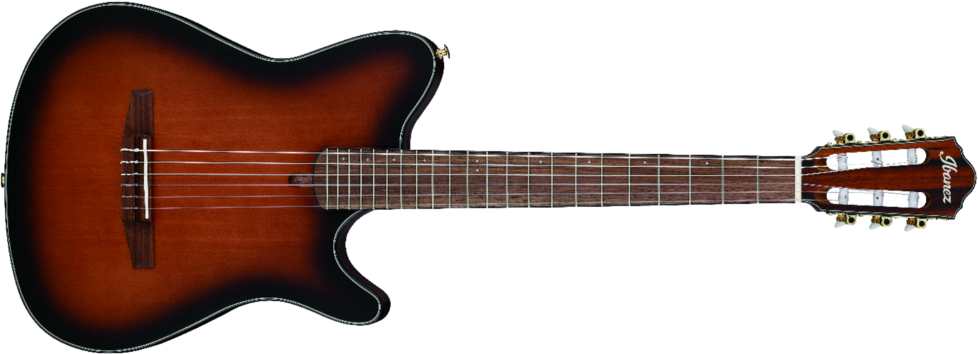 The IBANEZ FRH10 BSF hybrid classical / electric guitar features thin, compact body and superior high fret access which contribute to the superb playability of this guitar. It has less feedback as there’s no sound hole on the body top. Fan bracing, which is commonly used for classical guitars, allows this guitar to have a warm and natural nylon string sound.