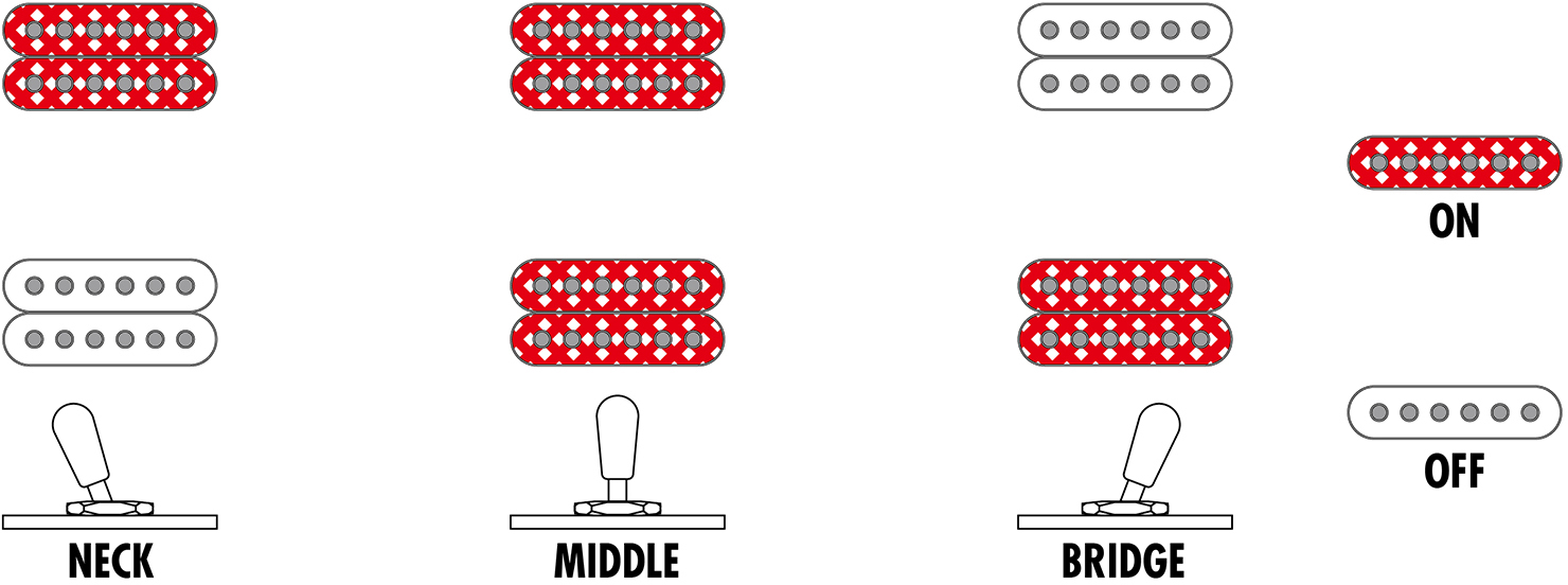 Fishman Fluence Modern humbucking pickups (AlNiCo V in the neck and Ceramic VIII in the bridge) associated with push-pull control allow to select between two voicings for each pickup.