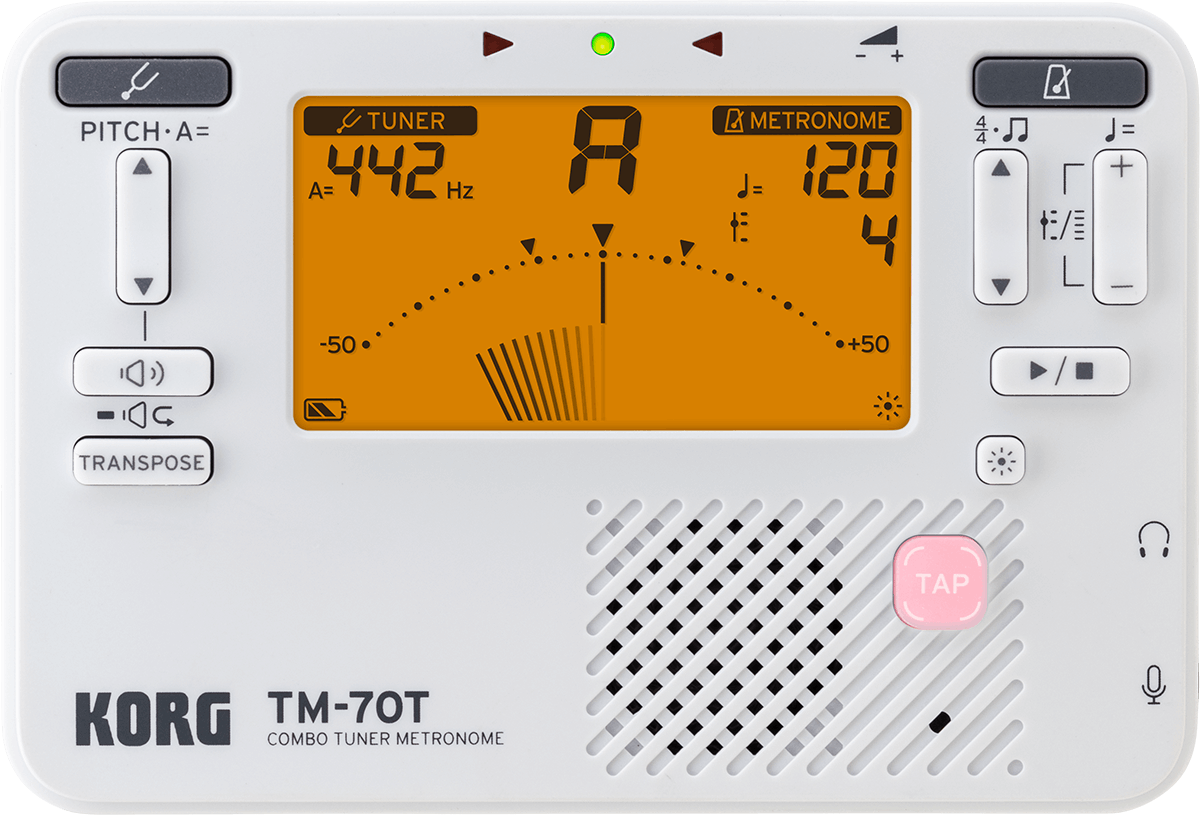 The TM-70T, further elevates the original concept making it easier to use than ever. It is not only small enough to fit in a pocket, but features a new display with improved visibility, and a new transpose function (F, Bb, Eb) , making it the ideal partner for any musician. The sound quality of the metronome and sound out has also been enhanced so that it is easy to hear even in noisy environments.