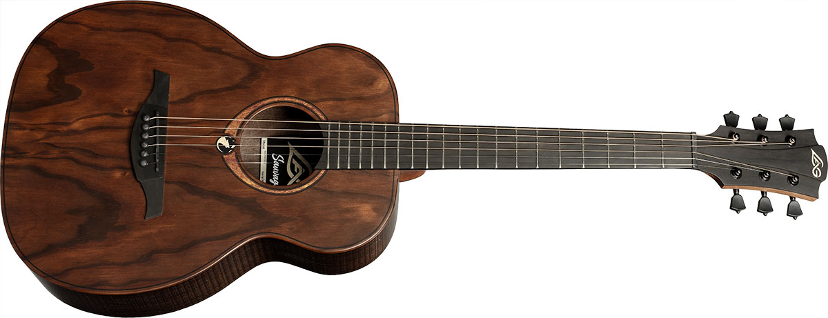 With its included gig bag, LAG Sauvage T Travel is a small body / short-scale acoustic guitar featuring solid Pale BrankoWood top, Eucalyptus back/sides, Khaya neck and Brown BrankoWood fretboard.