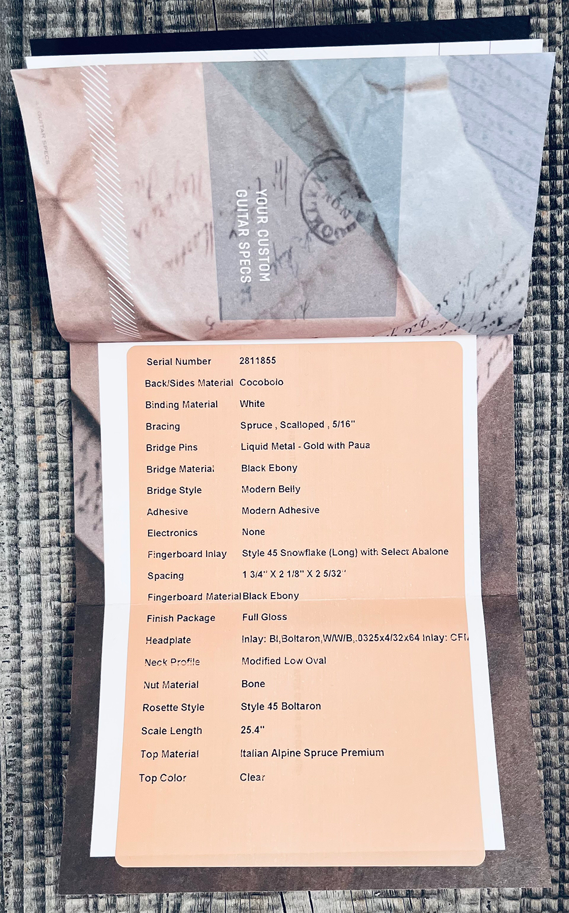 - Top : Solid Italian Alpine Spruce (gloss finish)