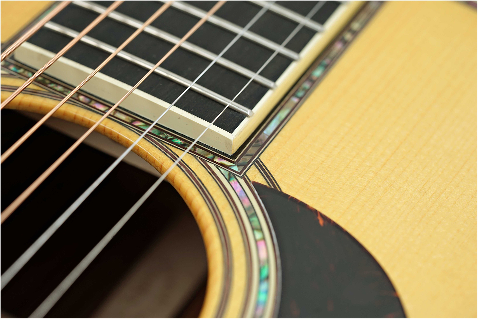 Crafted with premium tonewoods, the 000-42EC 30th Anniversary pairs a solid Adirondack spruce top with antique toner and solid Guatemalan rosewood back and sides. This combination delivers a warm, rich tonal depth, perfectly suited for both delicate fingerstyle playing and bold strumming. The scalloped Adirondack spruce Golden Era-inspired bracing enhances resonance and projection, ensuring this guitar fills any room with an unmistakably full-bodied sound.