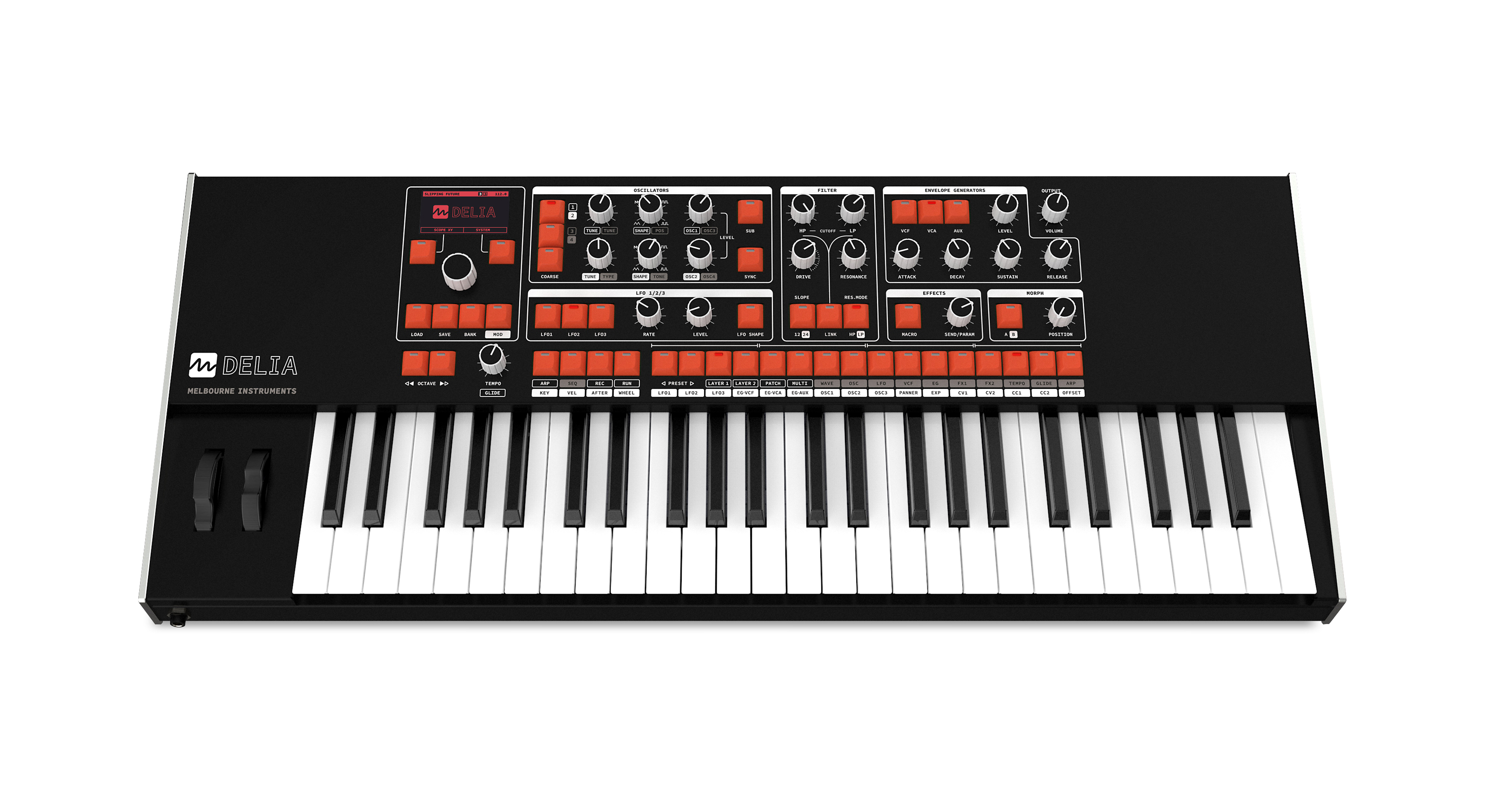 - Delia verfügt über eine anschlagdynamische und Aftertouch-sensitive Tastatur mit 49 Tasten, neue analoge Multimode-Filter, Hoch- und Tiefpass-Resonanzsteuerung, einen dreistufigen Overdrive und noch mehr Modulationsmöglichkeiten.