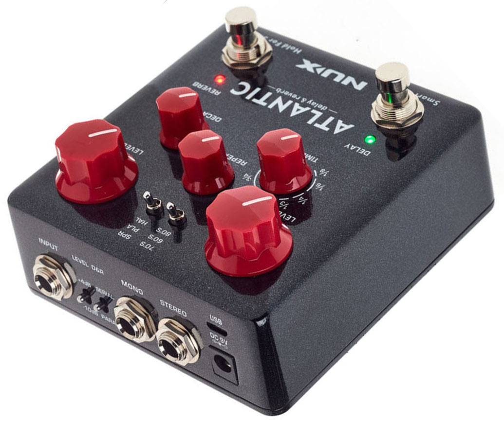 The NUX Verdugo Series Atlantic NDR-5 Delay & Reverb compact effect pedal covers several Delay and Reverb types that are very representative in history : 60's Tape-Echo, 70's BBD Analog Delay, 80's Digital Delay, Spring Reverb, Plate Reverb and Hall Reverb.