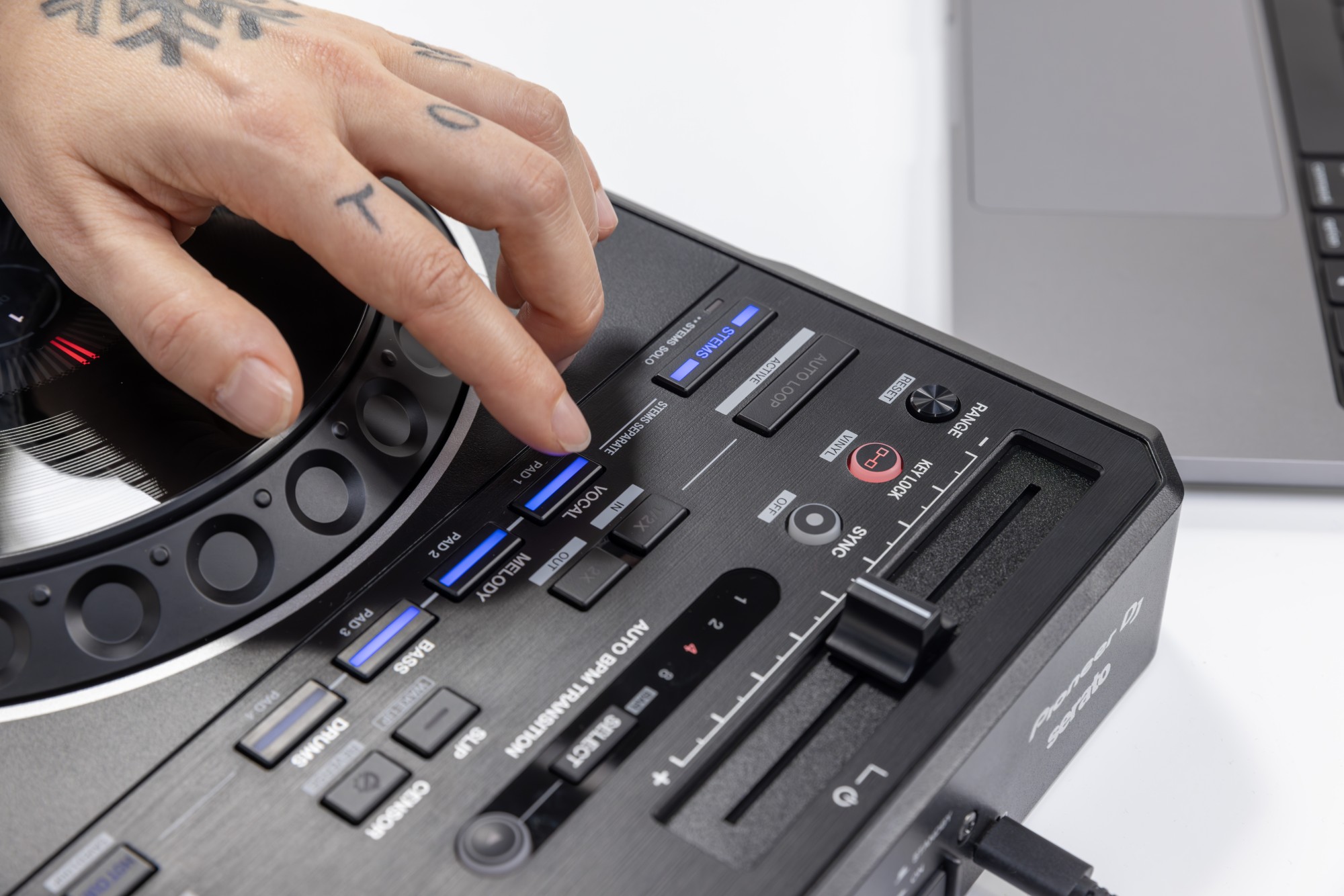 Sie sind für dynamische Auftritte in der Mixersektion platziert und emulieren die Mixerkonfigurationen der PLX + DJM-S-Serie, die von Open-Format-DJs auf der ganzen Welt geschätzt werden. über den Sektionen.