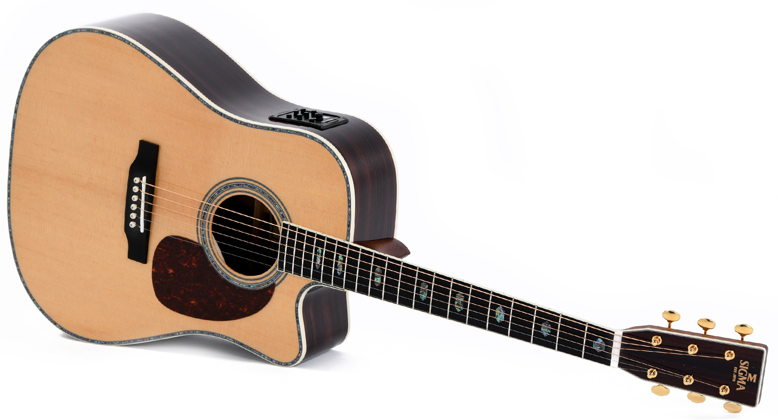 The SIGMA Standard DTC-41E is an acoustic/electric Dreadnought with cutaway guitar, featuring solid Sitka Spruce top, layered Basswood back/sides/neck and Micarta fretboard.