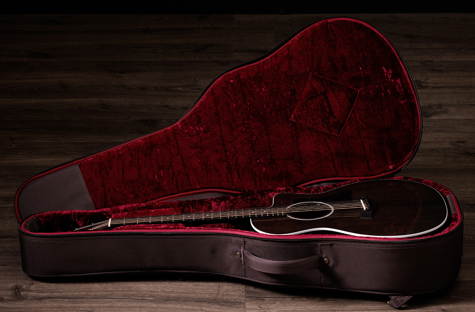 With the accommodating contours of the Grand Auditorium body, the slender Taylor neck profile and comfortable 1-11/16” nut width, players can expect a smooth feel with low action and easy fretting up the neck. Other appointments include a gloss-finish body with either white binding (trans blue and grey models) or black (trans red), Small Diamond fretboard inlays in Italian acrylic with a matching single-ring rosette, a black pickguard and satin black tuning machines.