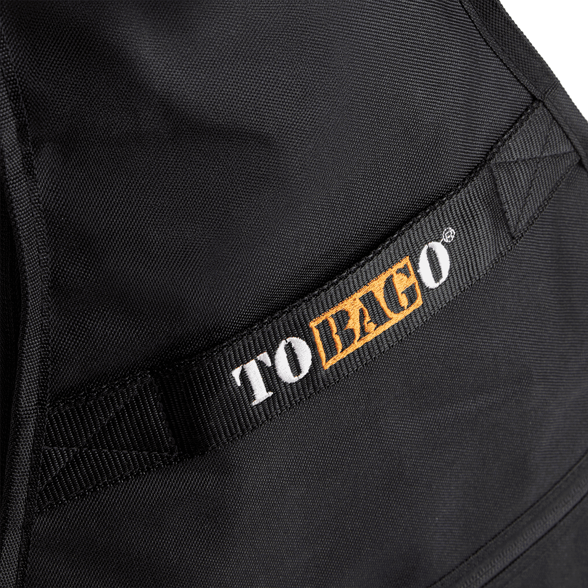 Equipped with a side handle and a front handle, both featuring the Tobago logo, the bag offers a secure grip. The adjustable straps offer various carrying options, adapting to the needs of electric guitarists.
